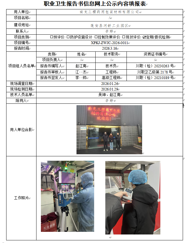 南充三樱药用包装材料有限公司职业病危害因素定期检测