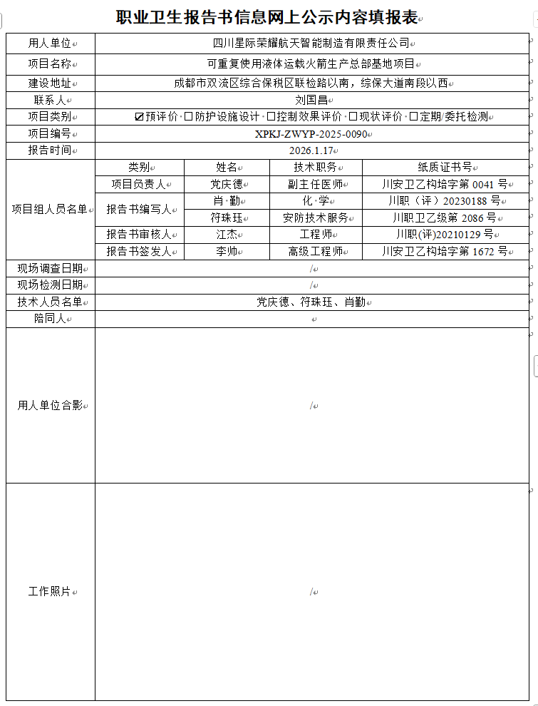 四川星际荣耀航天智能制造有限责任公司职业病危害预评价