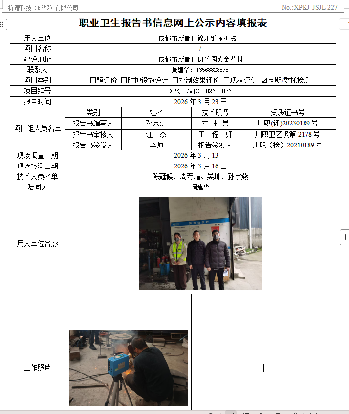 成都市新都区锦江锻压机械厂职业病危害因素定期检测