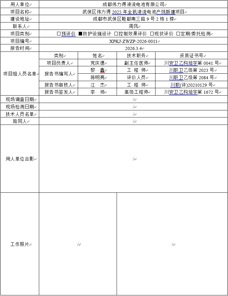 成都伟力得液流电池有限公司职业病防护设施设计