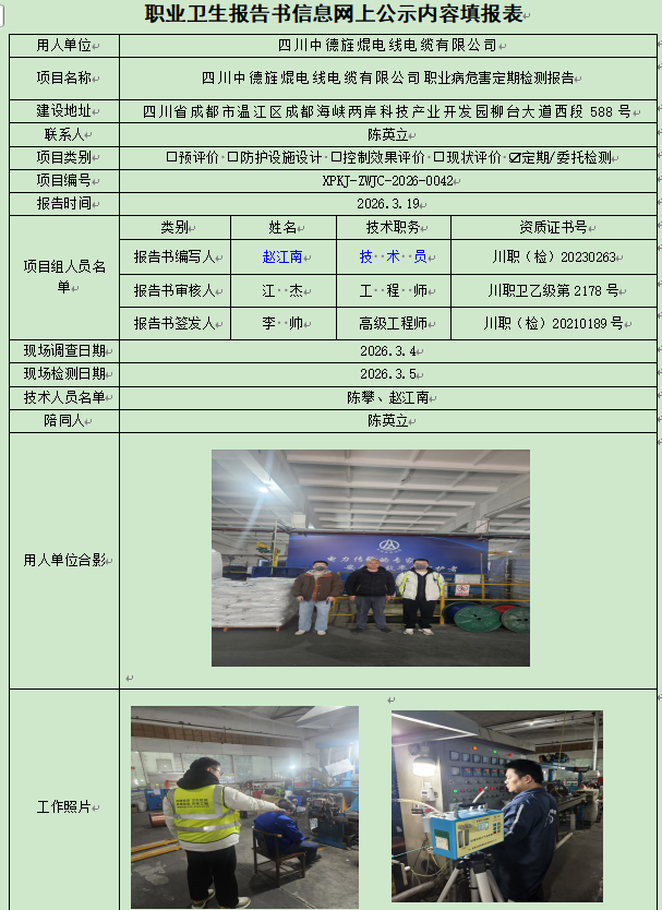 四川中德旌焜电线电缆有限公司职业病危害因素定期检测