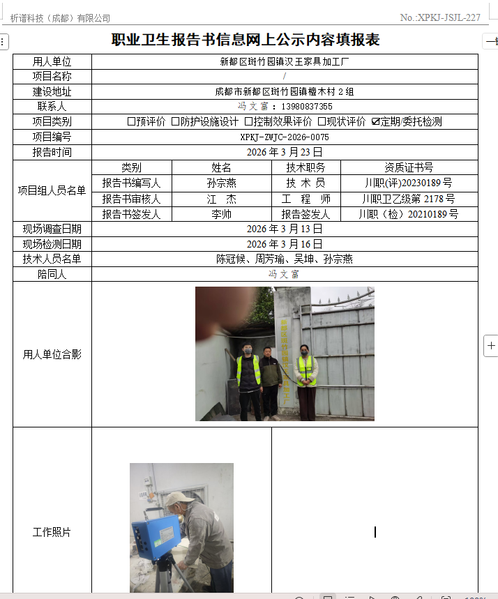 新都区斑竹园镇汉王家具加工厂职业病危害因素定期检测